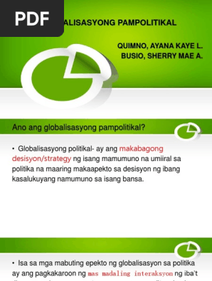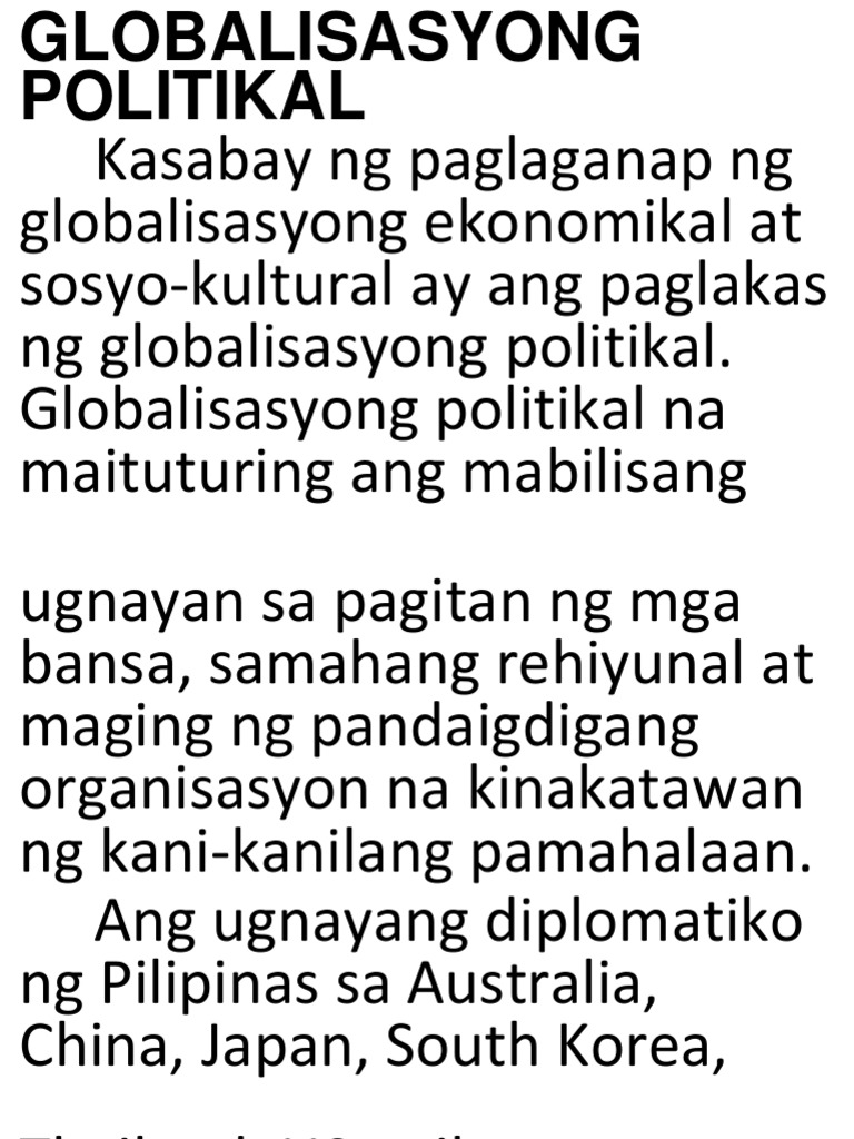 Pulitika Ang globalisasyong tumutukoy sa politikal na ugnayan ng mga bansa. 10262018 Globalisasyong Politikal Ang globalisasyong politikal ay ang mabilis na ugnayan sa pagitan ng magka-ibang bansa. Plus - Minus Chart.