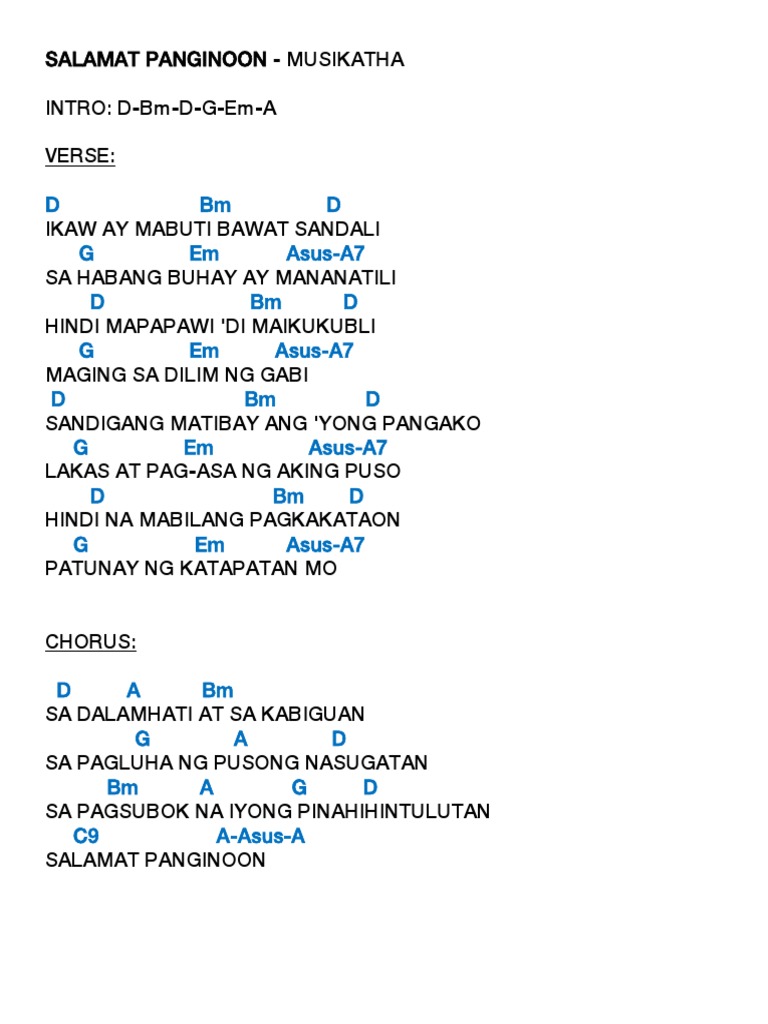 Isang awit ng pagpapasalamat sa kabutihan at katapatan ng Panginoon. 542020 Lyrics and chords for Salamat Panginoon a Tagalog worship song by Musikatha from the album Pagsambang Wagas. CM7 DM7 CE Ikaw ay mabuti bawat sandali Am7 DF G11 G Sa habang buhay ay mananatili CM7 Dm7 CE Hindi mapapawi o maikukubli Am7 DF G11 maging sa dilim ng gabi CM7 DM7 CE Sandigang matibay ang yong pangako Am7 DF G11 G lakas at pag-asa ng aking puso.