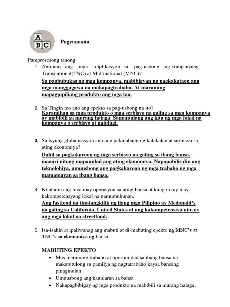 Answers Globalisasyong ekonomiko ay ito ang pakikipag ugnayan sa ibang bansa para sa ekonomiya ng nasabing bansa. Isa-isahin at ipaliwanag ang mabuti at di-mabuting epekto ng mncs at tncs sa ekonomiya ng bansa. Ang mabilisang ugnayan sa pagitan ng bansa samahang rehiyonal at pandaigdigang organisasyon na kinakatawan ng kani-kanilang pamahalaan.