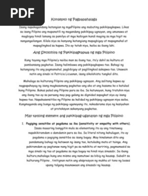Ano ang konsepto ng pakikipagkapwa-tao. Naipakikita ito ng mga Pilipino sa pamamagitan ng pagmamalasakit sa kapwa kakayahang umunawa sa damdamin ng iba empathy pagtulong at pakikiramay bayanihan at sa pagiging mapagpatuloy hospitable. Binigyang kahulugan naman ni Jocano 1997 ang pagkamakatao bilang having.
