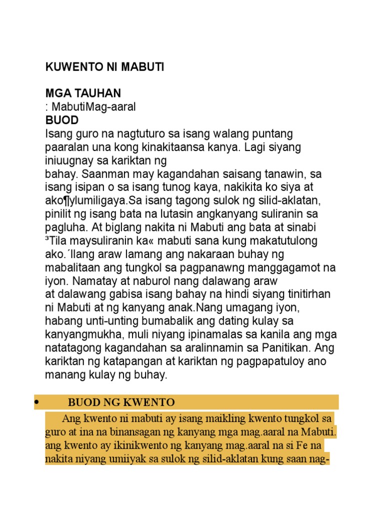 Edit Uminog ang istorya sa buhay ni Mabuti isang guro habang kinukwento mula sa punto de vista ng isa sa kanyang mga estudyante. Pababang Aksyon PABABANG AKSYON 12. Kwento ni mabuti buod - 2392454 Answer.