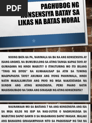 PAGHUBOG NG KONSENSIYA BATAY SA LIKAS NA BATAS MORAL KONSENSIYA Lipio 2004 ph2 o Pinaka praktikal na paghuhusga ng isipan na magpapasya na gawin ang mabuti at iwasan ang masama. Panimula Kahit na tayo ay mayaman o mahirap lahat tayo ay may pantay-pantay na karapatan.