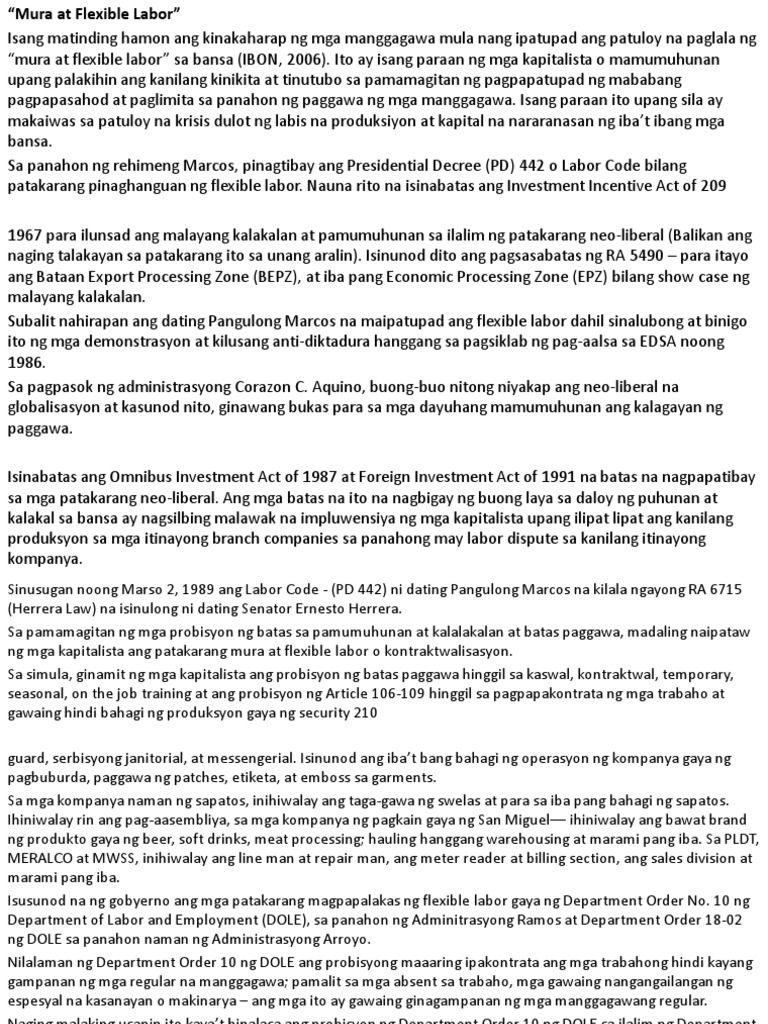 RA6715 artikulo 106-109 ang batas kung saan nagkakaroon ng pagpapakontrata ang mga trabaho Contractualization. 9202018 Ang ating pangulo ay nagbigay ng pangako noong siya ay tumatakbo pa lang na papahalagahan niya ang mga karapatan ng manggagawa sa pamamagitan ng paglaban sa kontraktwalisasyon. Ano ang Hindi mabuting epekto ng subcontracting sa mga manggagawang Filipino.