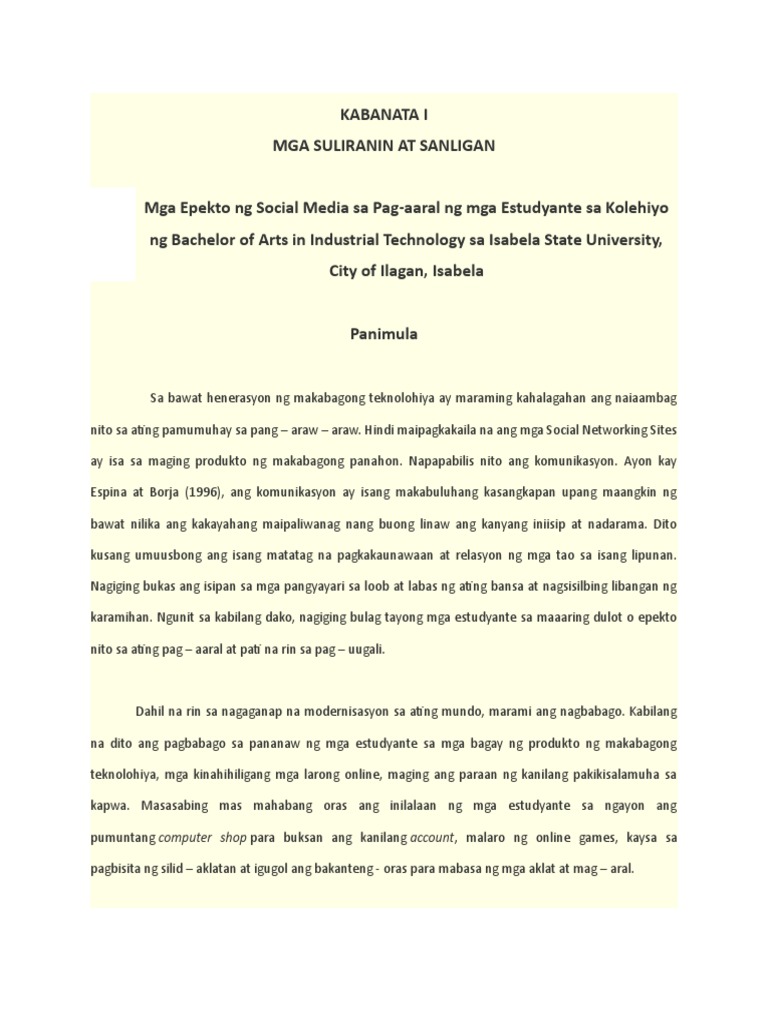 1 See answers Another question on Filipino. Filipino 28102019 1629. LAYUNIN NG PAG-AARAL Layunin ng mga mananaliksik na malaman ang mabuti at masamang epekto ng social media sa wikang Pilipino sa paraang pag-oobserba sa mga kabataang umaabuso sa pag gamit ng Facebook Instagram Twitter social netwoking sites at iba pang mediang lunsaran ng komunikasayon.