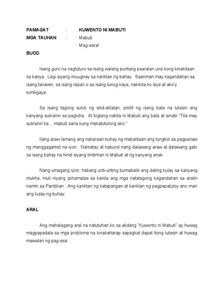 Kwento ni mabuti pagsusuri. Ang Kwento ni Mabuti ni Genoveva Edroza-Matute By alyssamallari Updated. Ang kwentong Ang Kwento ni Mabutiay may uri napangkatauhan sapangkat tinitingnan natin ang katauhan ni Mabuti sa kwento. One of her master pieces is Kwento ni Mabuti.