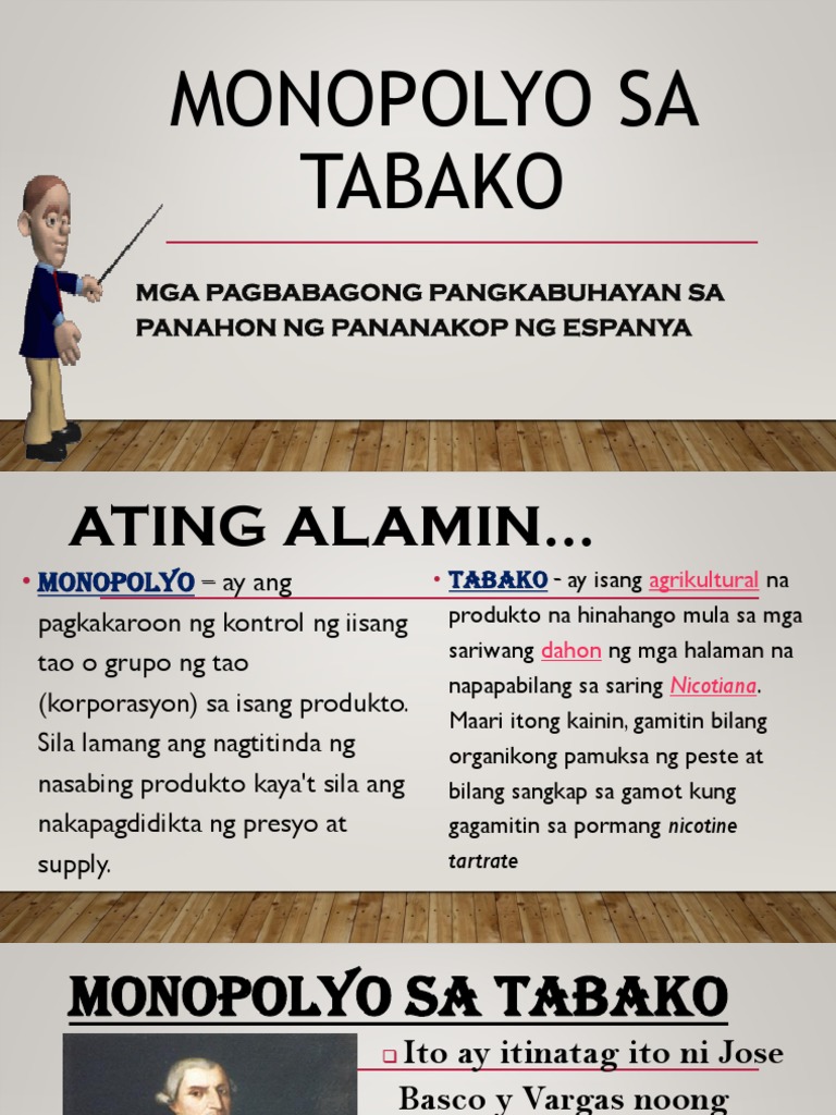 TABAKO MGA PAGBABAGONG PANGKABUHAYAN SA PANAHON NG PANANAKOP NG ESPANYA ATING ALAMIN Monopolyo ay ang Tabako - ay isang agrikultural na pagkakaroon ng kontrol ng iisang produkto na hinahango mula sa mga sariwang dahon ng mga halaman na tao o grupo ng tao napapabilang sa saring Nicotiana.