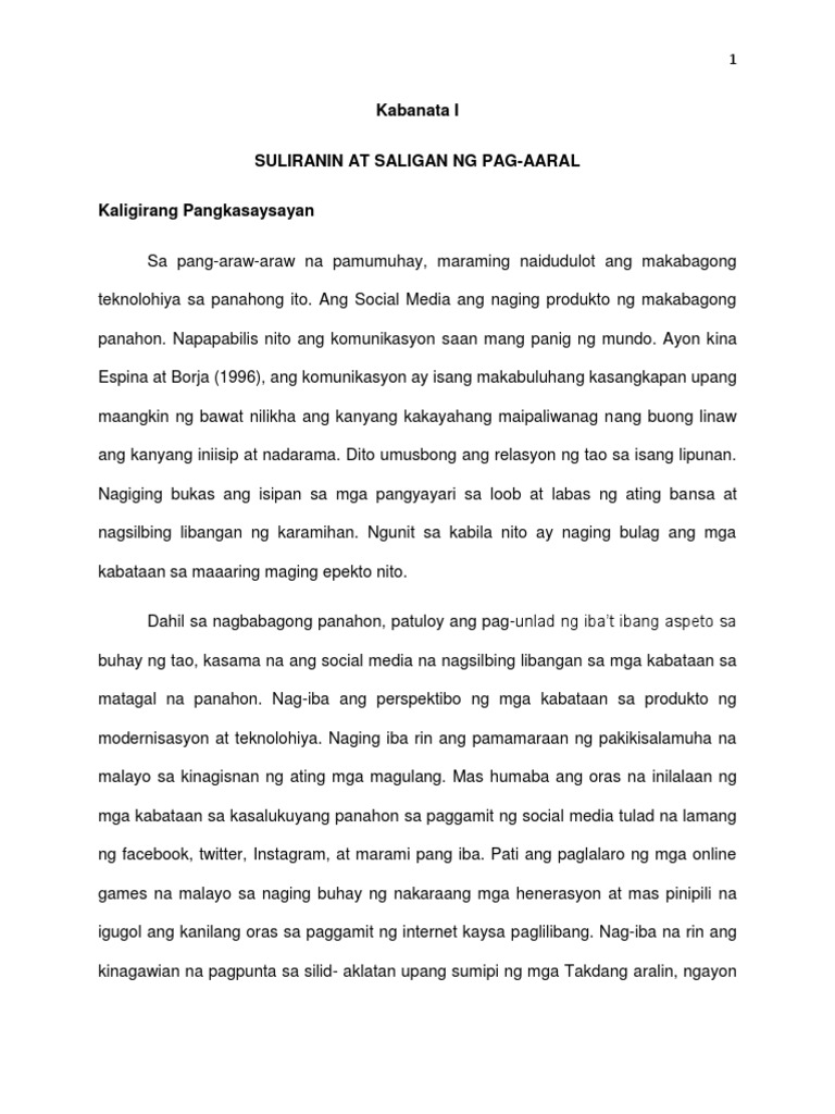 Paglalahad ng Suliranin Ang pananaliksik na ito ay naglalayong matukoy kung ano ang Epekto ng Social media sa Kabataan ng Barangay Marahan Alfonso Cavite Taong Panuruan 2017- 2018. 9242017 Ilan sa mga mabubuting epekto ay ang madaling pagkalat ng mga kaalaman o mga impormasyon mabilis na pakikipag ugnayan sa mga taong kasama sa trabaho o hindi man. Kayat ang layunin ng pag aaral na ito ay kumalap ng impormasyon para tuklasin ang epekto ng Social Media sa mga kabataan.